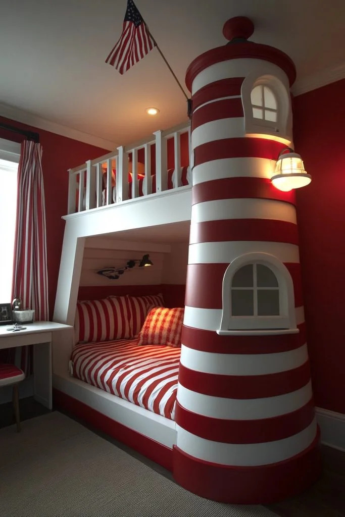 Lighthouse Lookout Lounge is a coastal preppy teen bedroom that embodies the vigilant and guiding spirit of a lighthouse. It features striped wall accents in red and white, a bed canopy that mimics a lighthouse top, and a desk area that resembles a lookout point. Decorative elements like a model lighthouse and maritime signal flags enhance the theme, while robust, practical furniture ensures the room is as functional as it is thematic. This bedroom is perfect for teens who admire the historical and protective nature of lighthouses.
