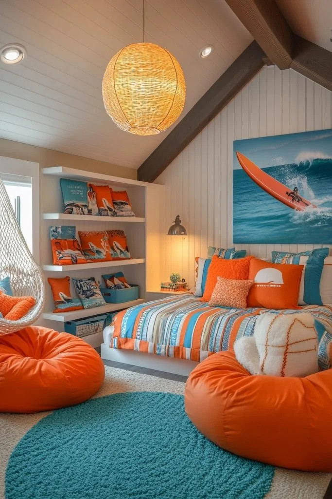 The Preppy Pier Hangout is a vibrant coastal preppy teen bedroom, featuring bright colors and bold patterns reminiscent of beach towels and surfboards. The inclusion of comfortable bean bags and a small indoor hammock turns the room into a casual lounge area, perfect for hanging out with friends. Coastal room decor elements such as driftwood art pieces and a sandy palette create a laid-back beach vibe. This room is designed to be a fun and energetic space that reflects a teen’s lively spirit.