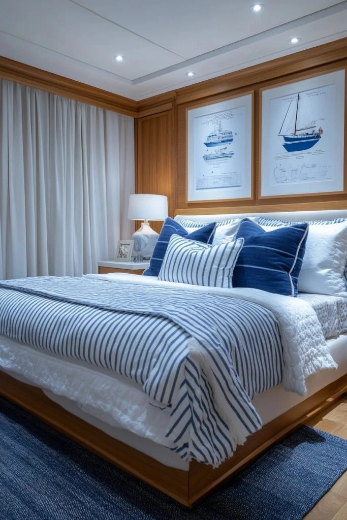 For a classic coastal preppy look that instantly adds sophistication and visual interest, create a striped accent wall behind the bed. Choose broad, horizontal stripes in a timeless combination like navy blue and crisp white. This bold yet clean pattern evokes a nautical feel and serves as a strong focal point. Pair this with a simple, upholstered headboard in a solid color to allow the stripes to shine. This design element perfectly captures the essence of preppy style while bringing in the fresh, clean lines of coastal aesthetics.