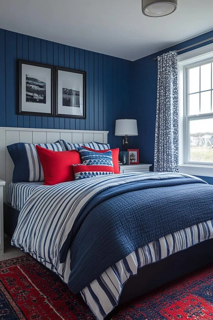 Sailor Stripe Sanctuary is a vibrant coastal preppy teen bedroom that uses bold sailor stripes in blue and white to create a dynamic and energetic space. The stripes are featured on walls, bedding, and window treatments, balanced by solid-colored decor in reds and navy for depth. The room includes functional furniture like a study desk and bookshelves, styled with maritime objects such as a compass and binoculars. This bedroom is ideal for teens who love the classic nautical look and want a space that feels both lively and orderly.
