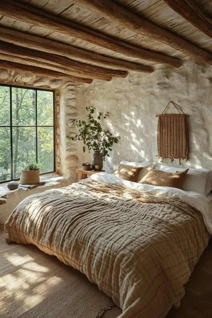 Wilderness Whisper Room is designed for quiet reflection and relaxation, featuring soft, muted colors and simple, unobtrusive furniture. Textural elements like a woolen rug and woven wall hangings add interest without overwhelming the space. This bedroom is ideal for those who seek a minimalist approach in their cozy cabin bedrooms, focusing on tranquility and simplicity.