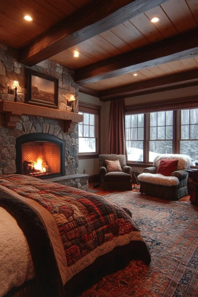 Bear Creek Boudoir features rugged, sturdy furniture and rich, earthy tones that echo the wilderness outside. Decorative elements like bear motifs (in art or sculpture) and native patterns add character and a strong sense of place. Thick, warm bedding and a heavy woolen rug ensure comfort is at the forefront, making it a quintessential example of cozy cabin bedrooms. This room is designed for those who appreciate a strong, rustic aesthetic and a connection to wildlife.