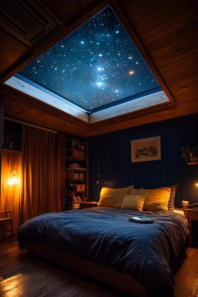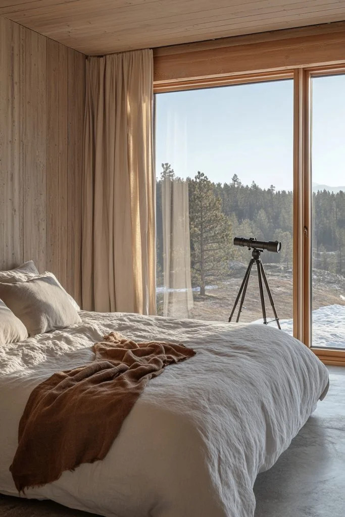 Stargazer’s Loft features a skylight or large windows positioned for optimal viewing of the night sky, making it a dream for astronomy enthusiasts. The decor is simple and dark, enhancing the experience of stargazing from the comfort of bed. This bedroom is perfect for those who have a passion for the stars and want to incorporate that into their cozy cabin bedrooms.