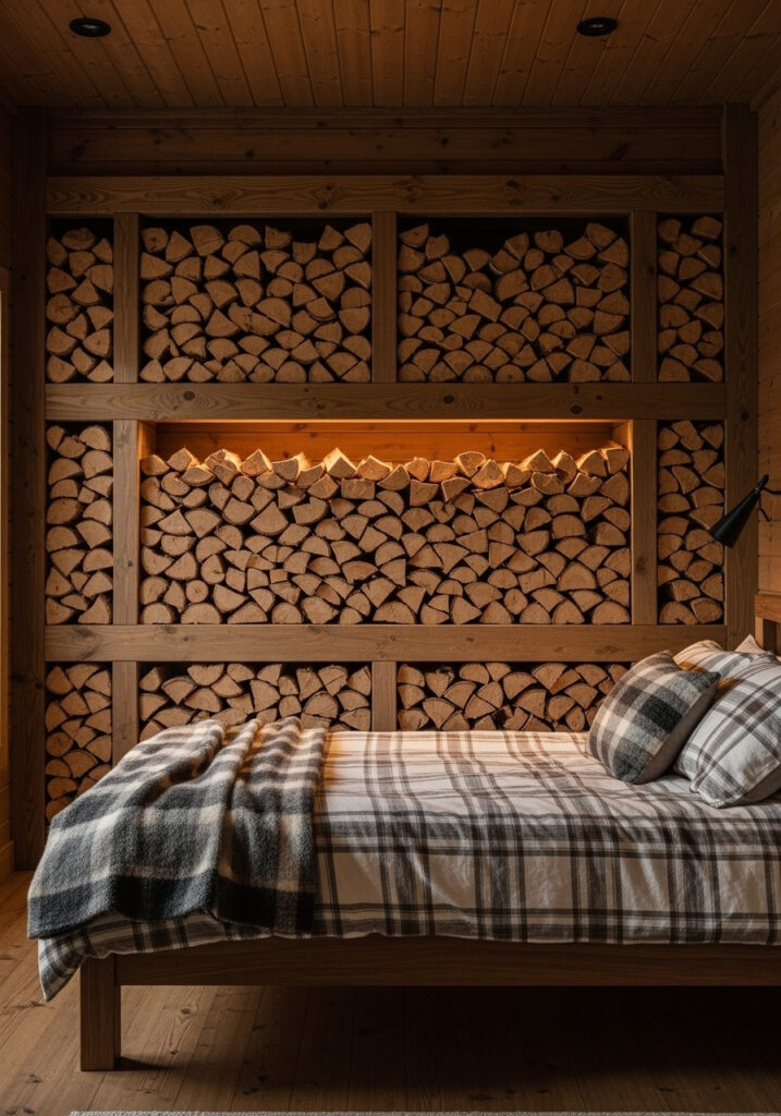 For a truly authentic and warm cabin aesthetic, create a feature wall of neatly stacked firewood. This design involves building a recessed or framed section of a wall, typically behind the bed, where split logs are stacked from floor to ceiling. This not only adds incredible texture and a powerful visual statement but also brings the comforting scent of wood into the room. The firewood wall serves as a rustic, natural headboard and a focal point, perfectly blending the ruggedness of a cabin with a touch of curated design. This creates an inviting, cozy, and unique backdrop.