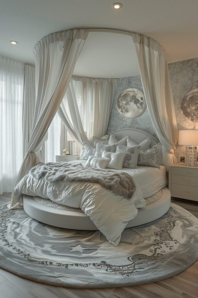 Let the moon’s glow guide you to sleep with Lunar Lullabies. Pale greys and silvers reflect lunar light, with subtle celestial patterns on bedding or curtains adding charm. Gentle lighting enhances the peaceful mood, making this a dreamy spot for moon-inspired relaxation.