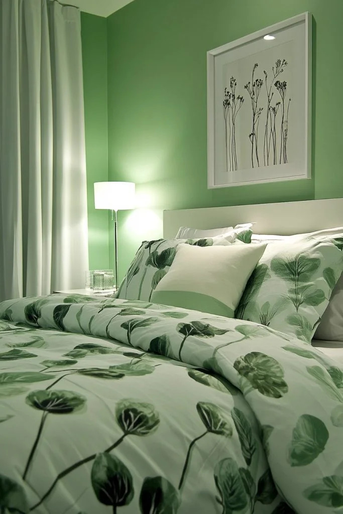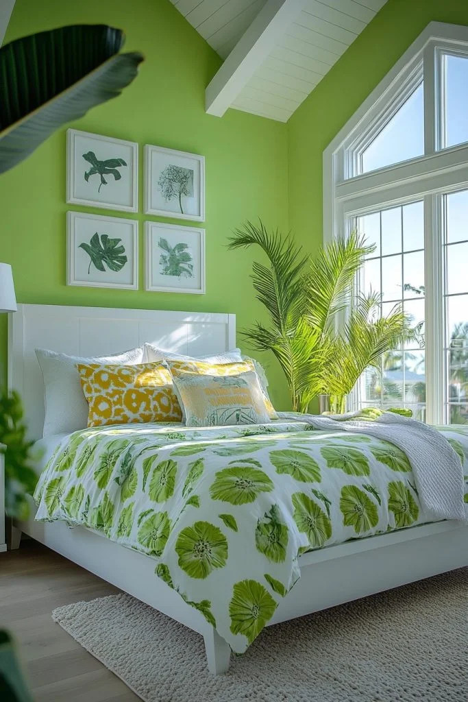 Fresh Lime Zest Chamber uses vibrant lime green accents to add energy and zest to the bedroom. The bright color stimulates creativity and positivity, making it a lively space. Modern furnishings and geometric patterns complement the energetic vibe. This room is perfect for those who appreciate a bold, contemporary look and want to infuse their space with a fresh, invigorating feel.