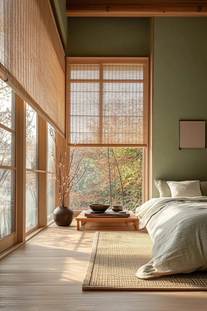 Bamboo Grove Bedroom uses light green and tan shades to mimic the tranquil and restorative environment of a bamboo grove. Real or faux bamboo furniture and accessories reinforce the theme. Soft, natural fabrics and minimalistic decor enhance the peaceful, organic feel. This bedroom is ideal for those seeking a serene, nature-inspired retreat.