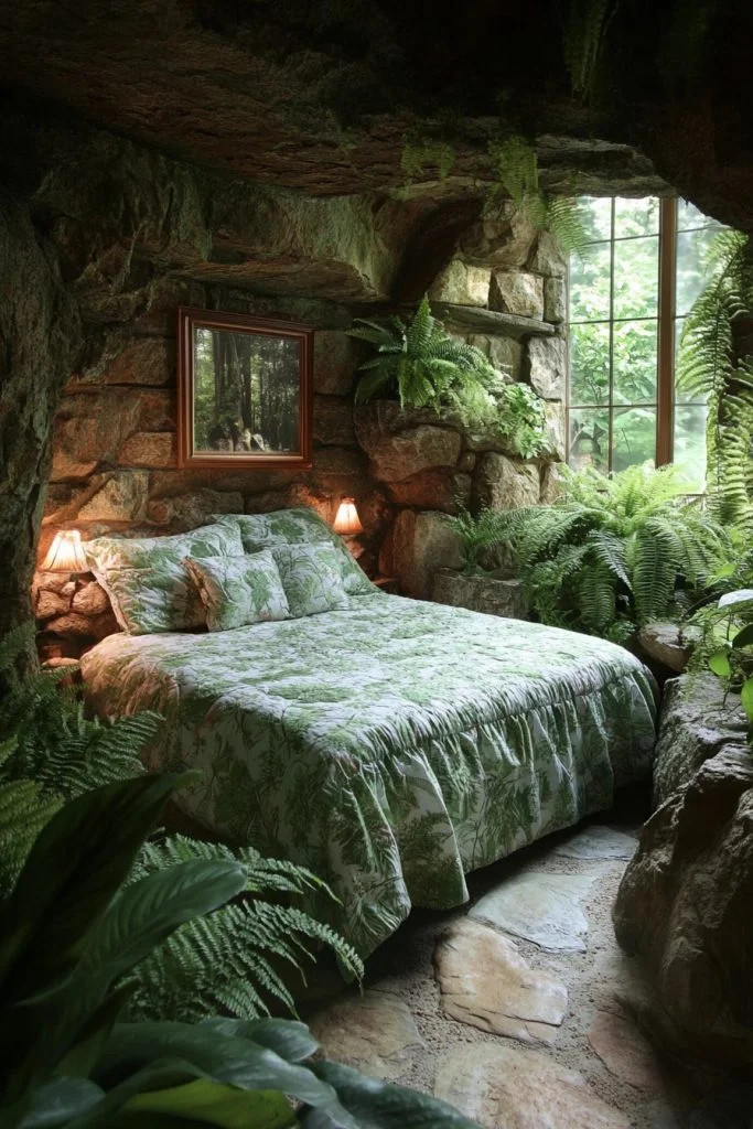 Fresh Fern Grotto features shades of fern green with lots of live ferns and other lush greenery, creating a natural and refreshing bedroom space. The inclusion of stone or water elements can mimic the cool, damp feel of a grotto. Soft, ambient lighting enhances the sense of a secluded hideaway. This bedroom is perfect for those who appreciate the calming qualities of a woodland retreat.