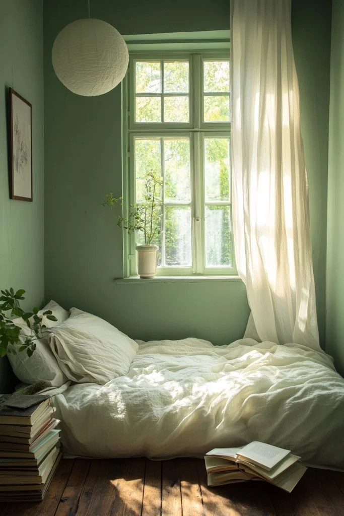 A Mint Whisper Quiet Nook features soft mint green walls and decor, offering a tranquil space perfect for green fantasy bedroom ideas. Light green tones are inherently soothing and ideal for relaxation and reflection. Minimalist decor and clutter-free surfaces reinforce the serene atmosphere. This nook is perfect for reading or meditating, with plush cushions and soft lighting, creating a peaceful escape within the bedroom.