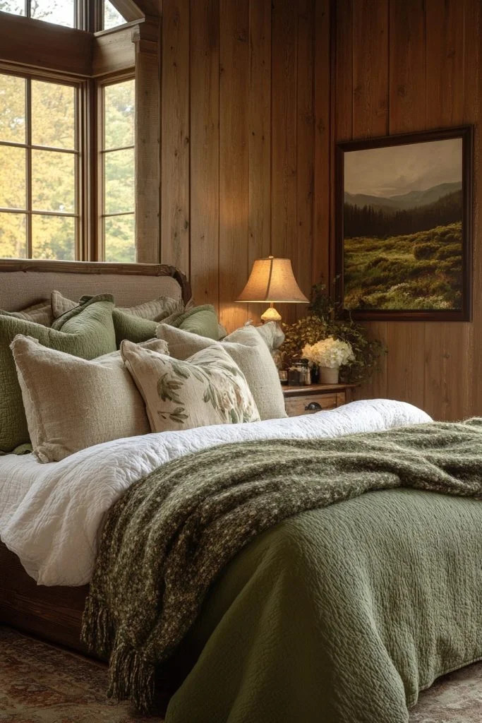 Evergreen Mountain Lodge features deep, evergreen tones that evoke the timeless beauty of mountain forests. Rustic wood furniture, like a log bed frame, and a stone fireplace enhance the lodge feel. Plaid patterns and cozy textiles like wool blankets add warmth and comfort. This bedroom is ideal for those who love the rugged, enduring spirit of mountain landscapes, creating a cozy and inviting retreat.