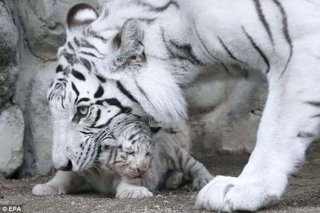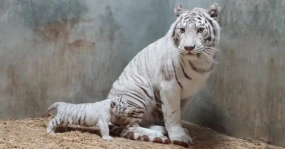 Of the three cubs, two are male and one female. They are still nursing but are beginning to explore solid foods, taking an interest in the meat that their mother enjoys. White tigers, while visually similar to Bengal tigers, are generally larger.