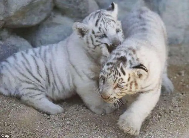 The cubs, measuring 11 to 16 inches and weighing around 11 pounds each, draw attention for their rare coloration, resulting from a genetic anomaly found only among white Bengal tigers.