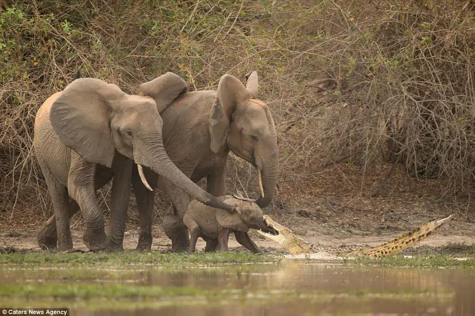 For the baby elephant and its mother, it was a brutal encounter, but the swift response of the herd averted a tragic outcome.
