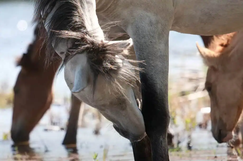 These horses are known for their unusual snorkeling behavior; eelgrass is a nutritious food source. In this rare habitat, newborns learn to swim within their first week and are later taught to “snorkel.”