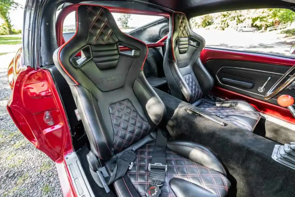 Inside, racing meets luxury with Braum racing seats adorned in black vinyl, red piping, and diamond stitching.