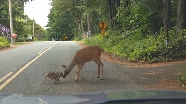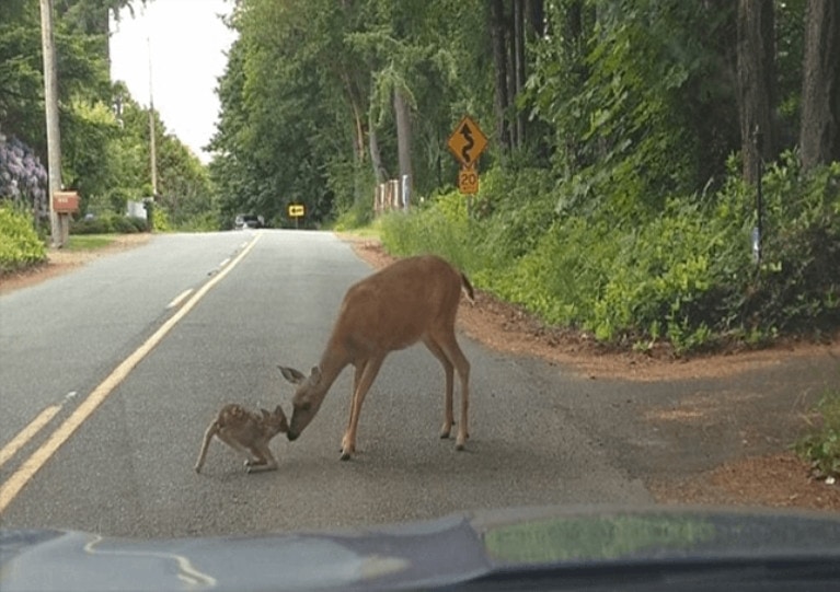 Fortunately, there wasn’t much traffic that day, giving the mother deer the time to rescue her offspring.