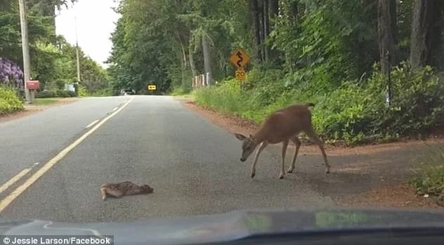 This heartwarming story unfolds on a road in Port Orchard, Washington, where a mother deer displayed remarkable maternal instincts to save her distressed fawn.