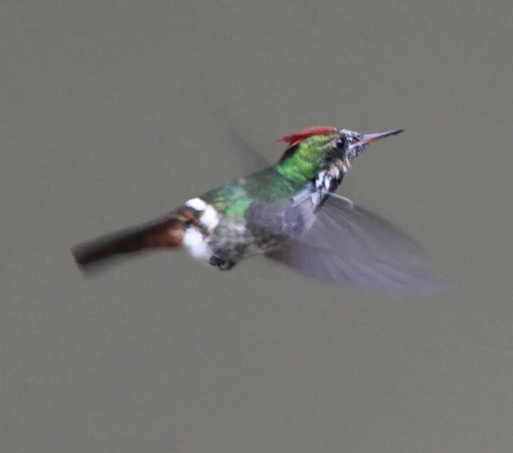 Sounds: While mostly quiet, the frilled coquette makes a brief “spark” sound during feeding. As it hovers, its wings emit a soft, bee-like hum.