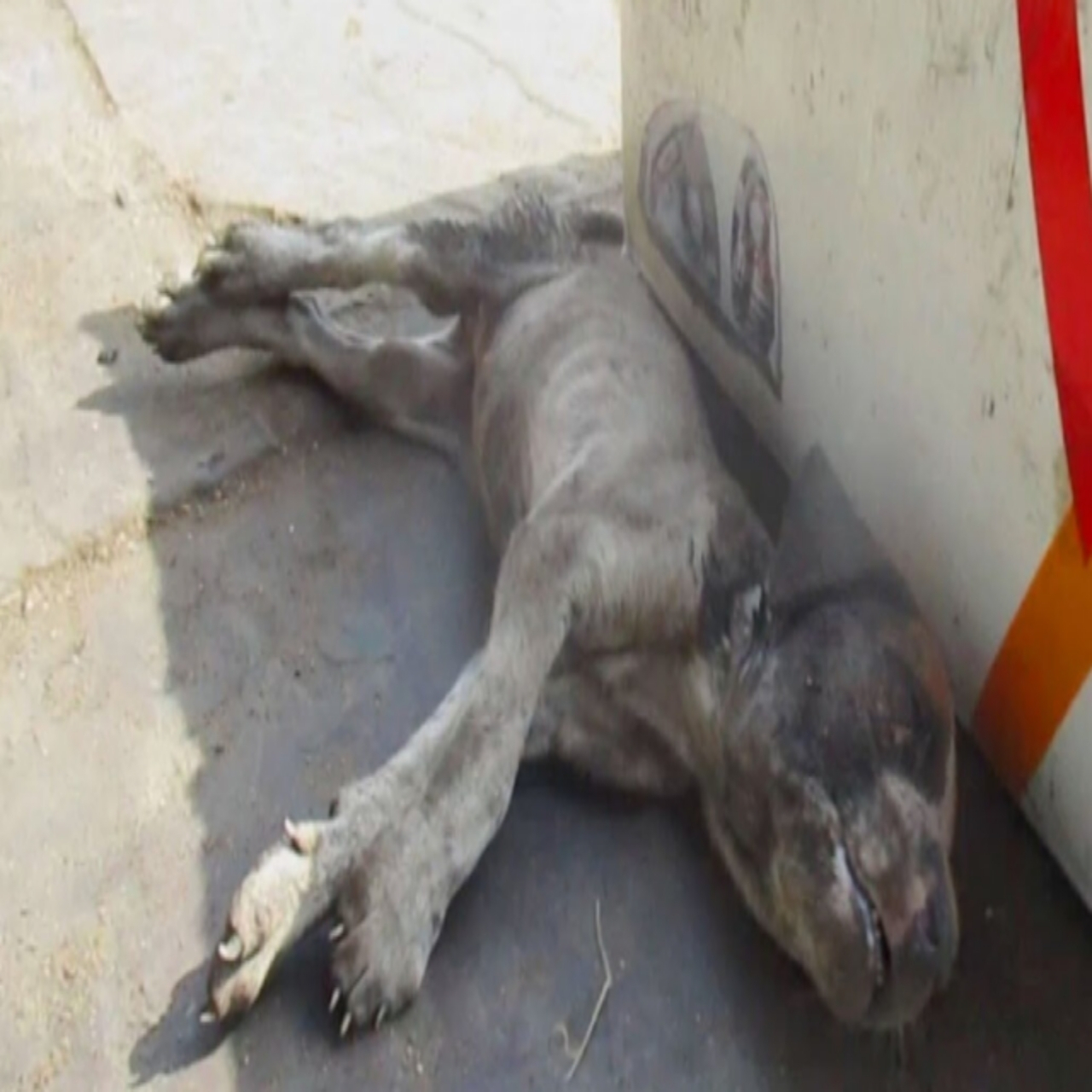 In a narrow alley, a dog lay abandoned, its past radiance now eclipsed by a coat turned dull and skin marked by neglect. Despite its frail condition and weary eyes, a flicker of hope could still be found in the animal’s gaze.