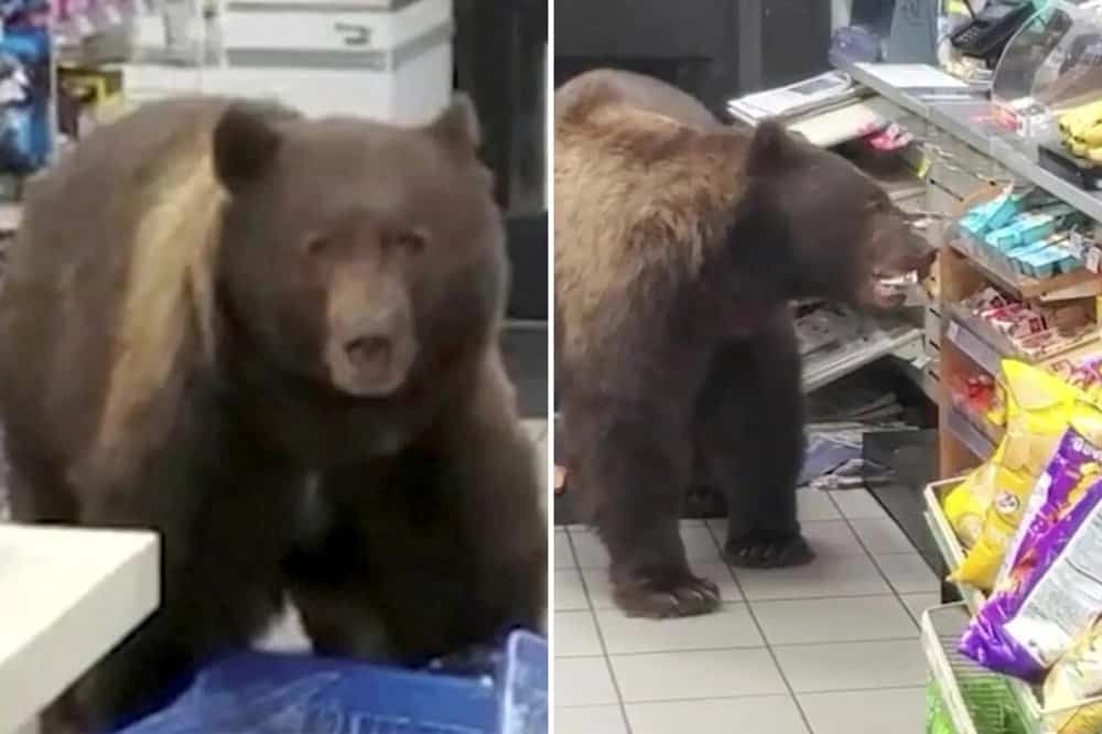 The footage shows the massive bear smashing its way through the store’s glass door, wreaking havoc among the aisles, and causing significant damage before fleeing from the scene, startled by a loud noise.