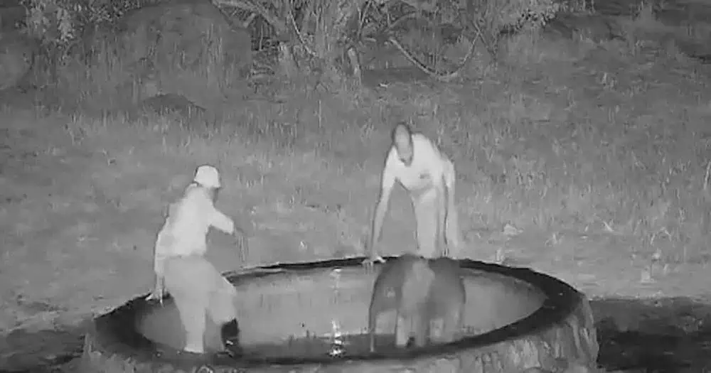 With utmost care, the two men entered the water pit and gently lifted the small, yet surprisingly heavy, baby elephant.
