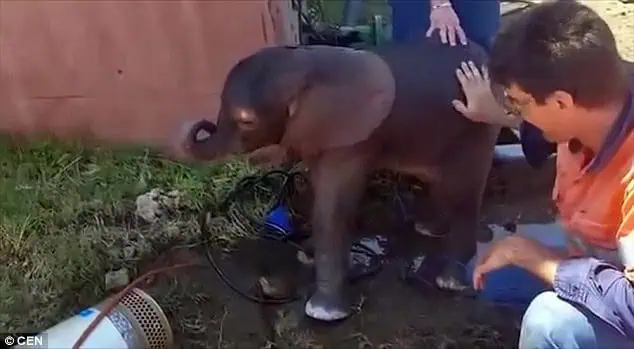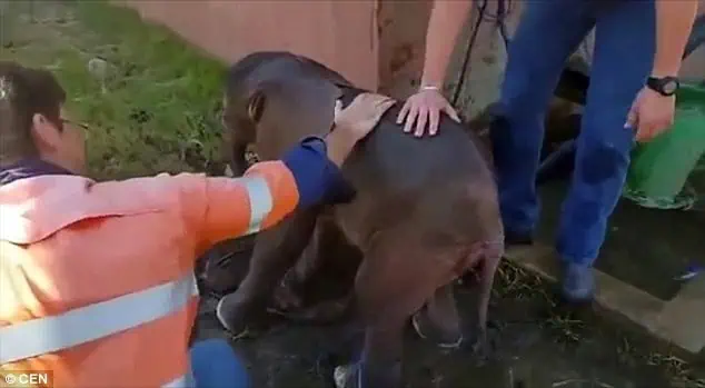 The young elephant was finally freed after an exhausting effort involving both men and the struggling calf.
