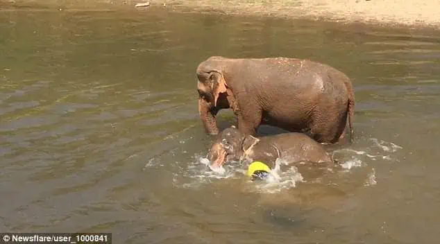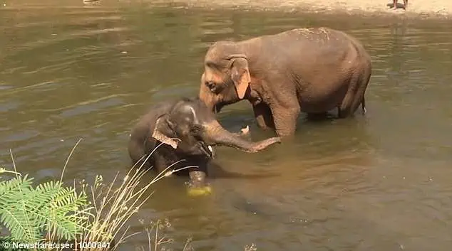 The footage, recorded on March 22 by local cameraman Channarong Tom Srisa-ard, aged 28, portrays the calf’s joyful water play under the careful supervision of its mother.