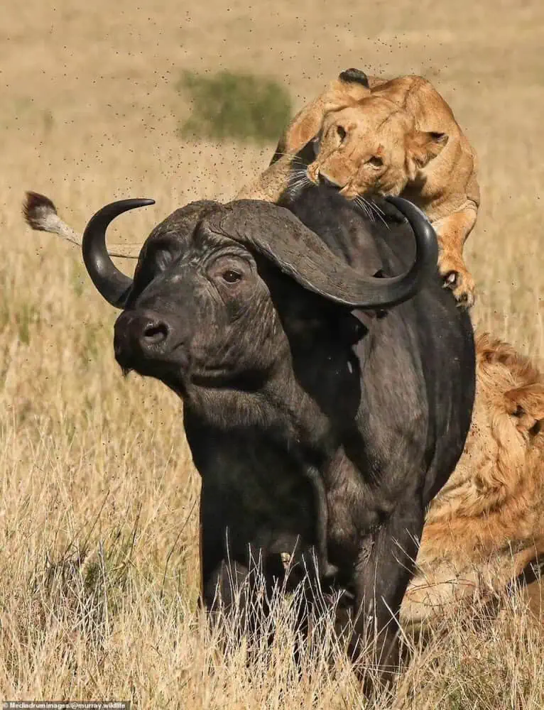 In a remarkable display of power, a pride of lions successfully brought down a 2,000-pound water buffalo in Kenya’s Maasai Mara.