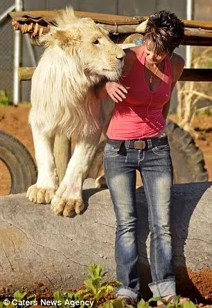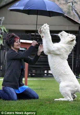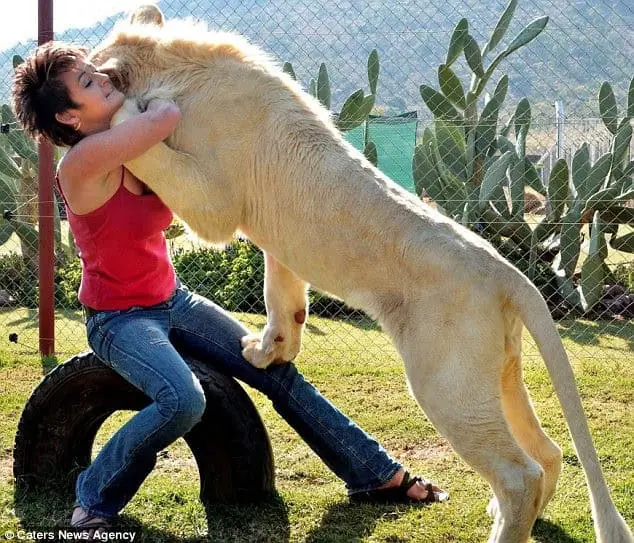 Weighing around 265 pounds (120 kg), this white lion has a bond with his owner that’s truly remarkable.