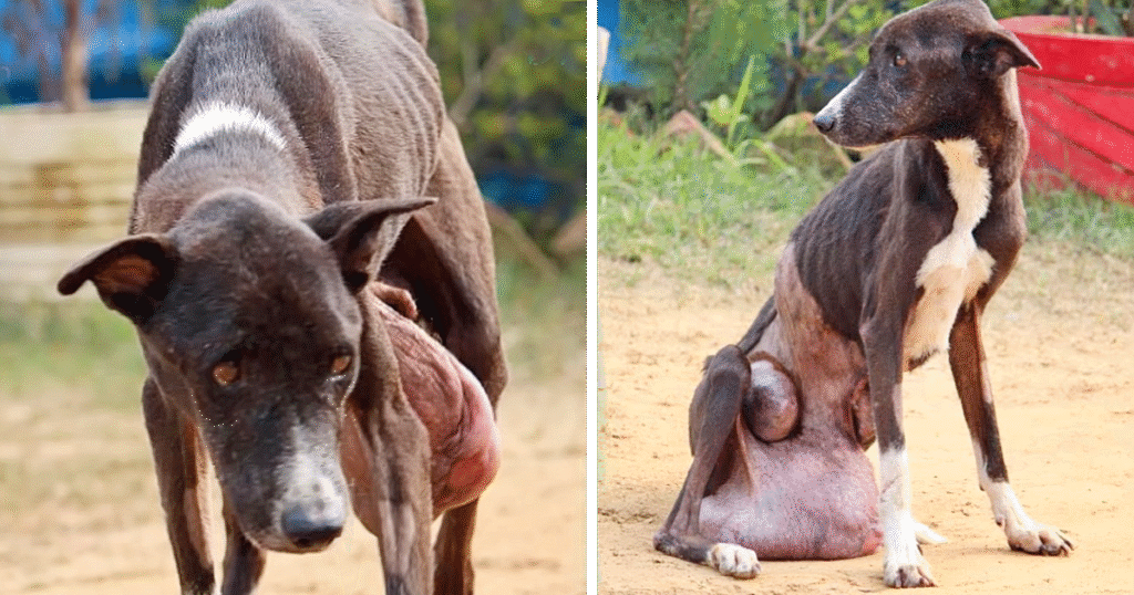 A helpless black dog was found by the roadside with a large tumor hanging from his abdomen, unable to move. Leaving him there was never an option for the rescuers who found him.
