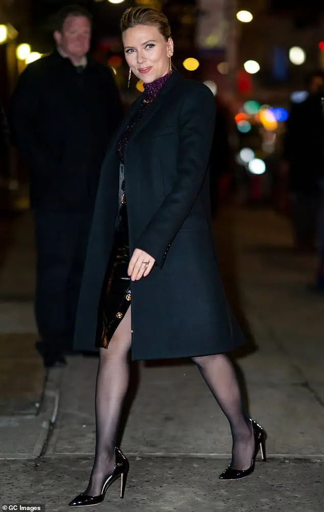 For her appearance, Scarlett donned a striking purple turtleneck blouse with subtle black detailing, which she complemented with a patent-leather high-waisted skirt.