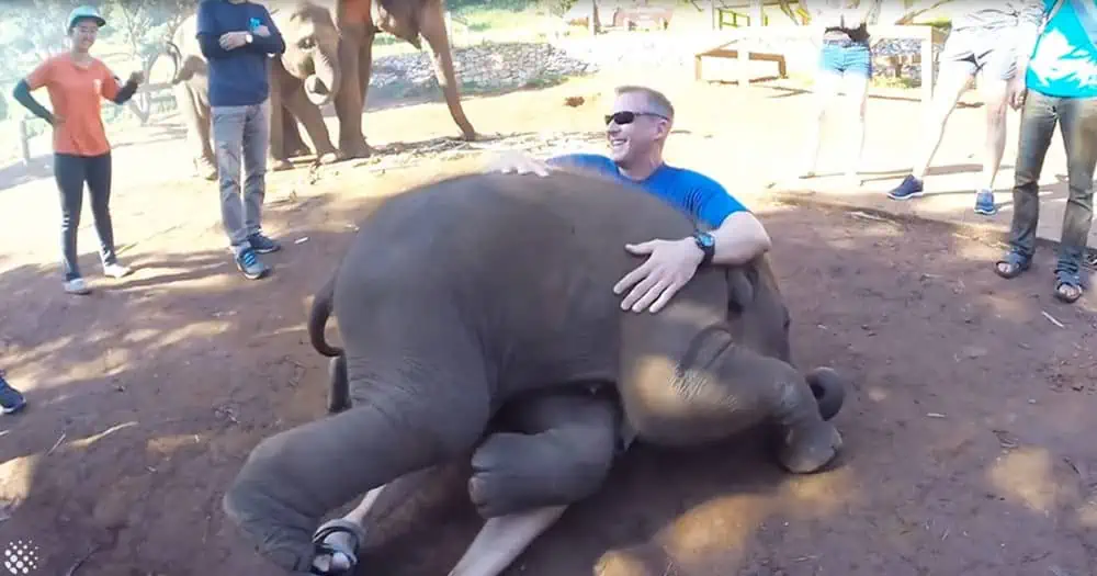 When you think he’s distracted and the cuddling session ends, this playful baby elephant charges toward the nearest person, craving even more hugs and cuddles.