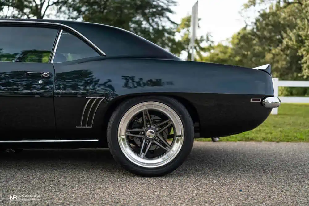 The exterior of this meticulously restored 1969 Camaro SS maintains its timeless allure while boasting a Dark High Gloss Green Metallic paint that shimmers under the lights.