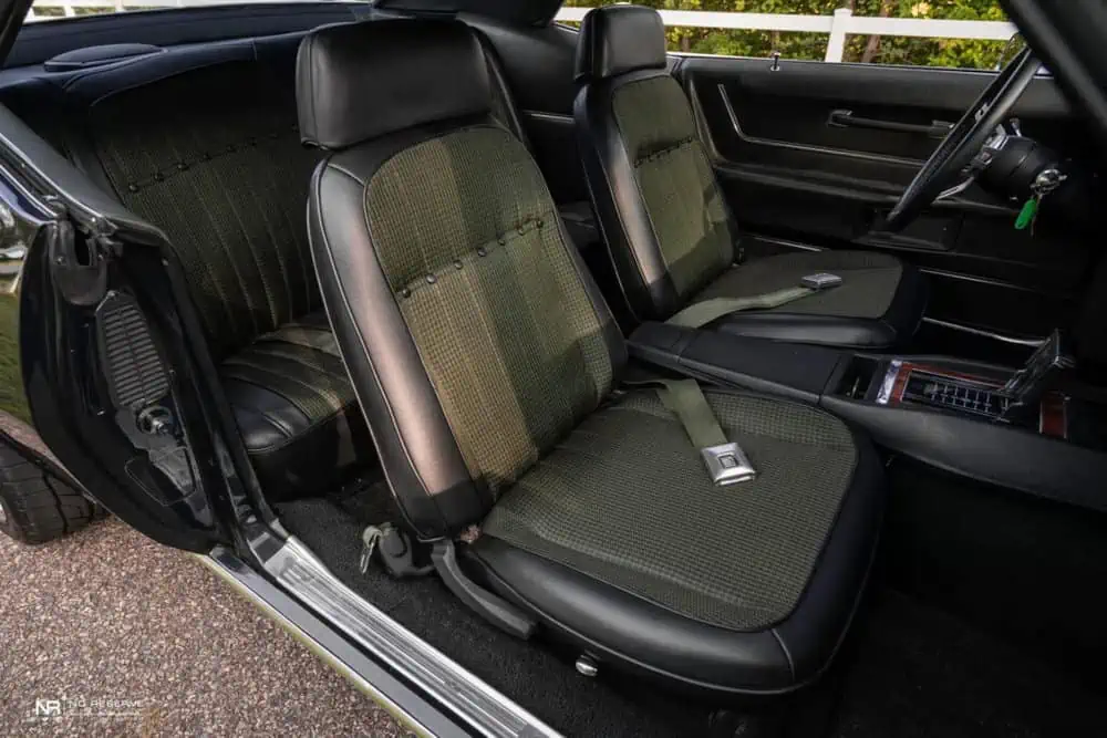 Step inside, and the cabin seamlessly blends period-correct style with modern comforts. Reupholstered front bucket seats in green houndstooth accentuate the meticulous restoration, while woodgrain accents complement the green interior theme.