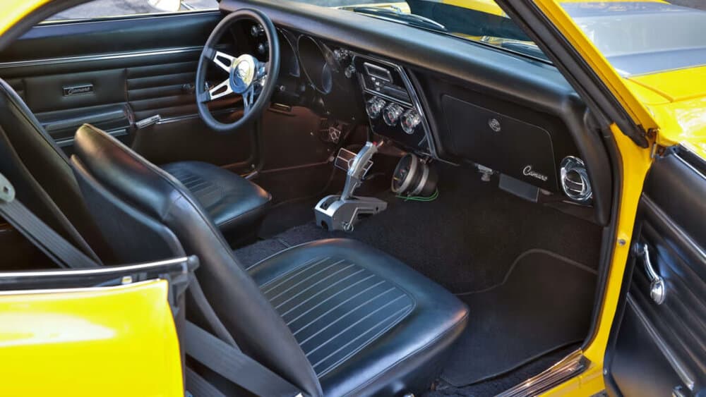 The visual charisma of the 1968 Chevrolet Camaro is immediate and undeniable. Its vibrant Rally Yellow hue, juxtaposed with Tarnished Silver racing stripes, ensures that all eyes are drawn to its presence.