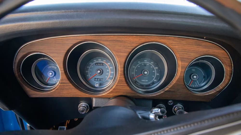 Stepping inside, one is greeted by the cozy embrace of deluxe woodgrain trim and period-correct white upholstery, transporting passengers back to the golden age of muscle cars.