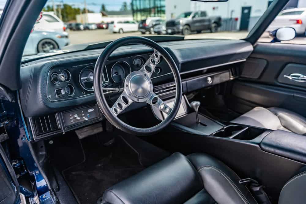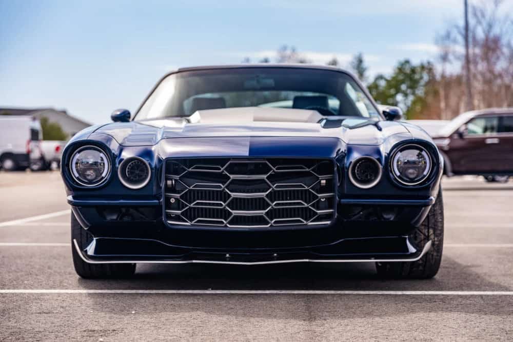 From the get-go, the mesmerizing exterior of “Split Decision” grabs attention. With a captivating metallic blue finish complemented by a matte silver stripe, the car boasts breathtaking body modifications, including a custom fabricated hood and front splitter, alongside a late model ZL1-style integrated grille.