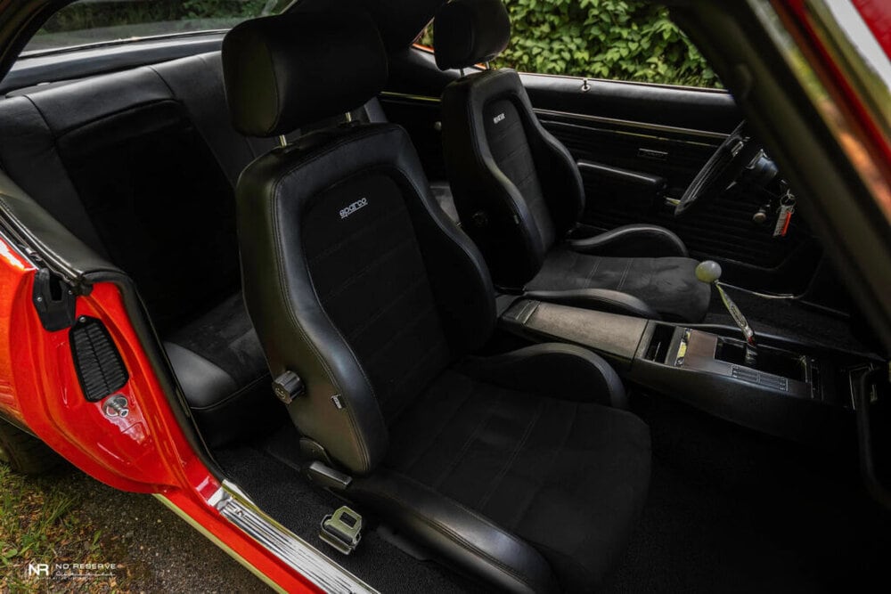 The interior offers a luxurious experience with the Restomodit Interior Package, Sparco Front Bucket Seats, and Suede Sparco Steering Wheel. Kenwood speakers, RetroSound Radio, and smartphone connectivity provide modern entertainment.