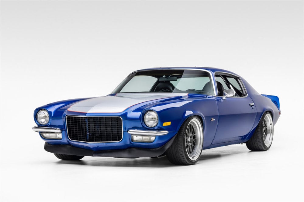 Prepare to be spellbound by the sheer might and charm of the 1970 Chevrolet Camaro. This iconic muscle car, draped in a mesmerizing metallic blue with striking silver stripes, stands as a true automotive legend.