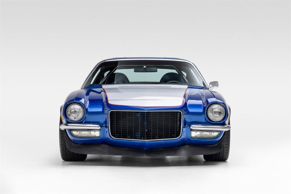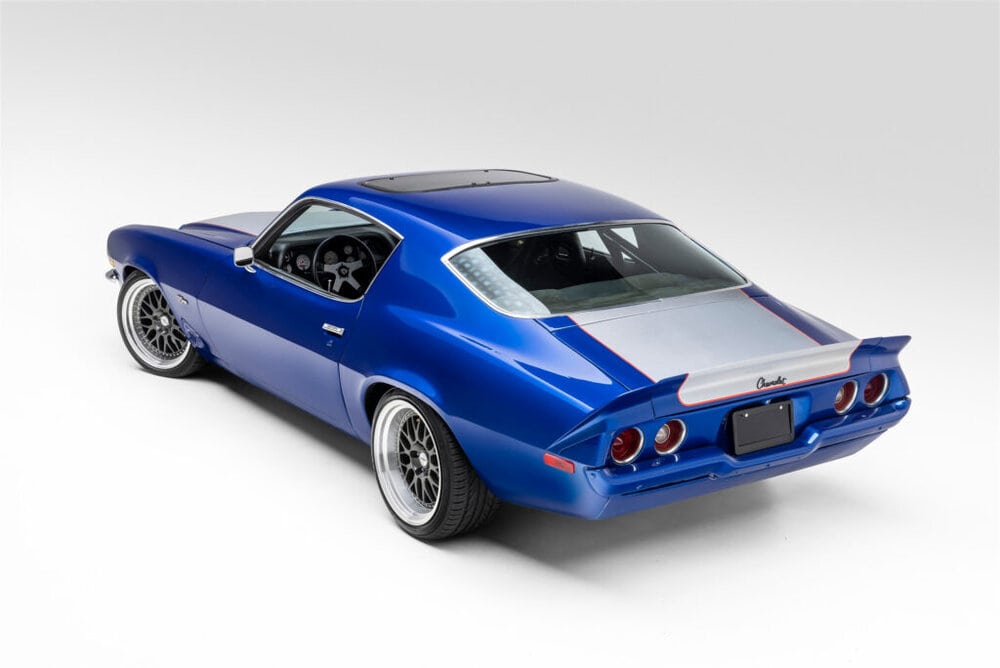 The essence of the 1970 Chevrolet Camaro is epitomized in its striking exterior. Bathed in a lustrous metallic blue adorned with eye-catching silver center stripes surrounded by bold red accents, this Camaro is a visual masterpiece.