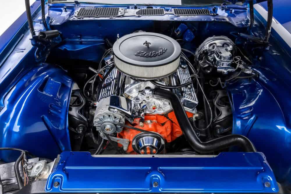 Equipped with an Edelbrock carburetor aluminum intake manifold and adorned with orange-painted block and cylinder heads, chrome valve covers, and tubular headers, this powerhouse is visually enticing and awe-inspiring in performance.