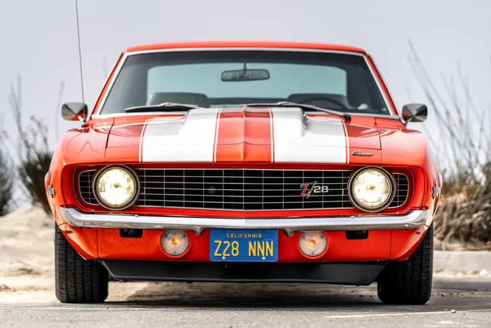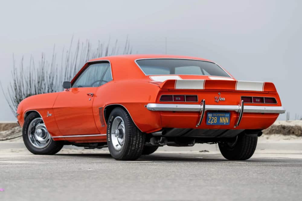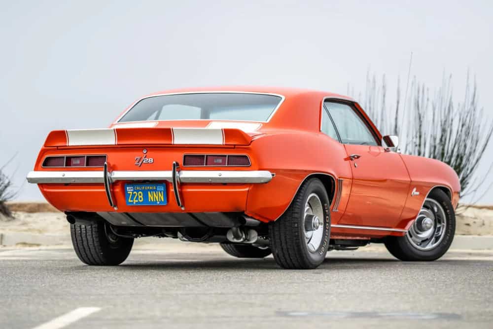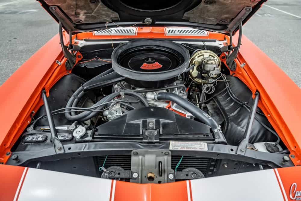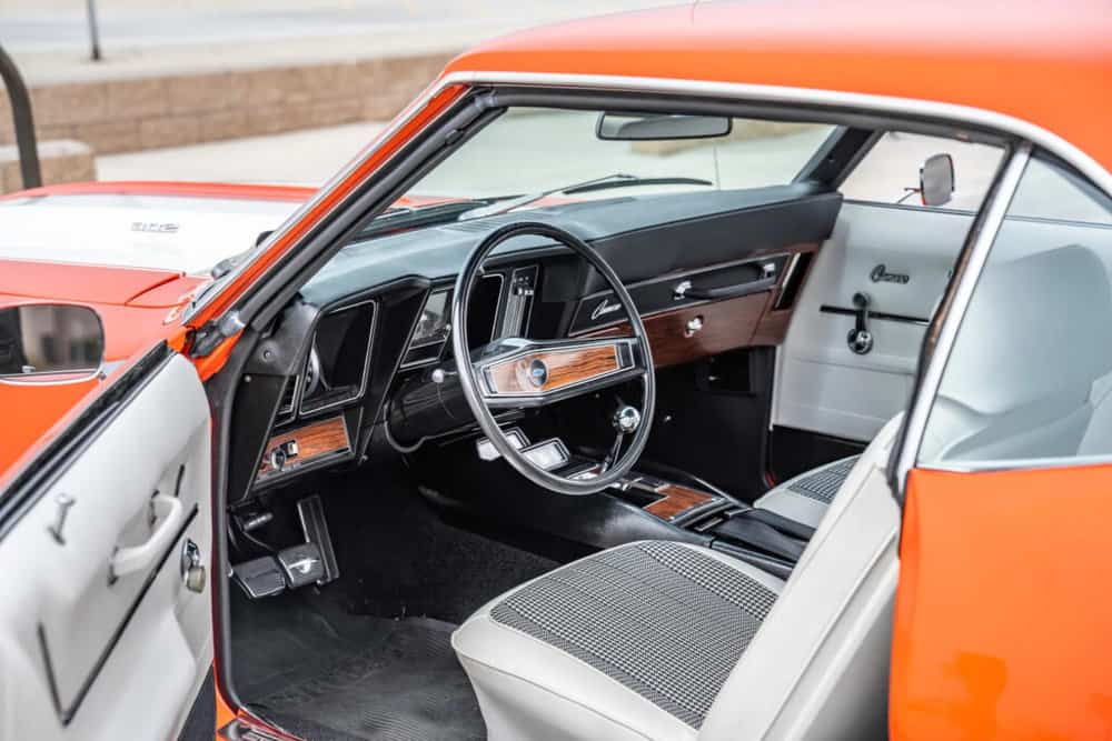 Sporting its signature Hugger Orange exterior, this ’69 Camaro exudes a commanding presence. The fresh coat of paint and dual white racing stripes accentuate its muscular design.