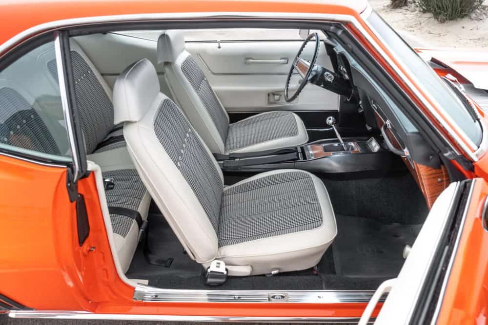 Stepping inside the Camaro reveals a meticulously restored cabin that pays homage to vintage muscle car culture.