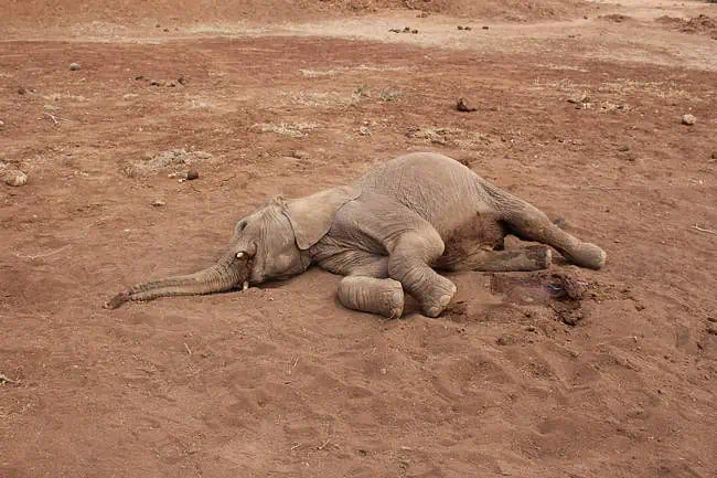 Upon arrival at the scene, the baby elephant was found struggling to breathe, lying on the ground.