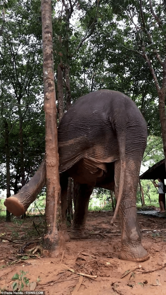 Cartoon, a 58-year-old Asian elephant, discovered the ultimate way to soothe an itch—by rubbing her entire body against a tree.